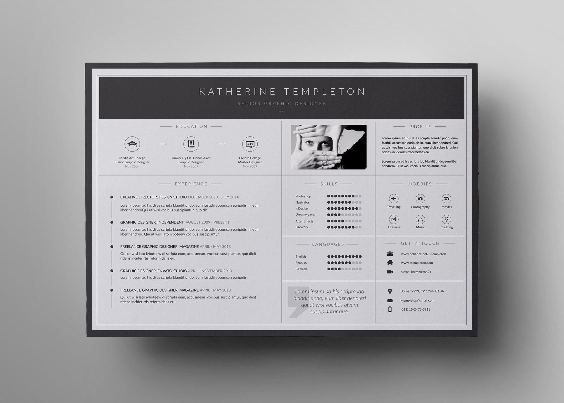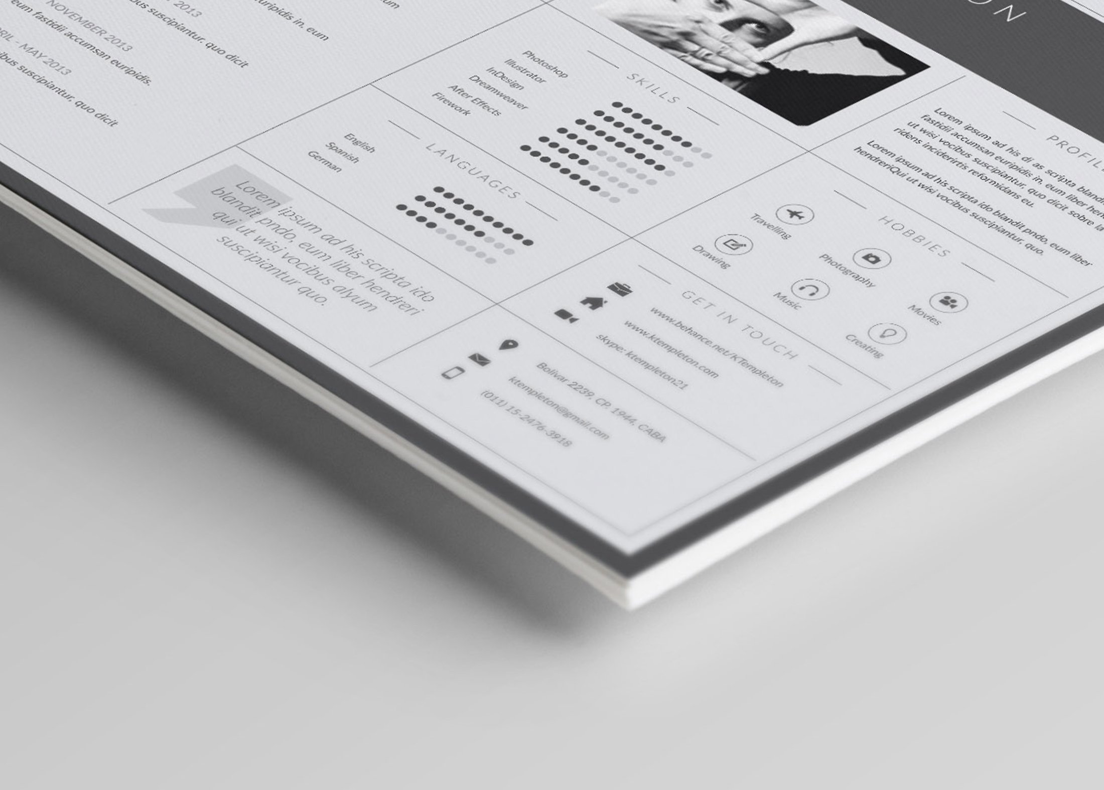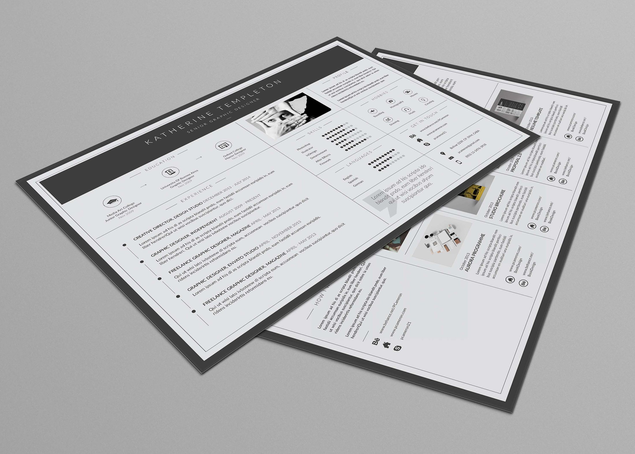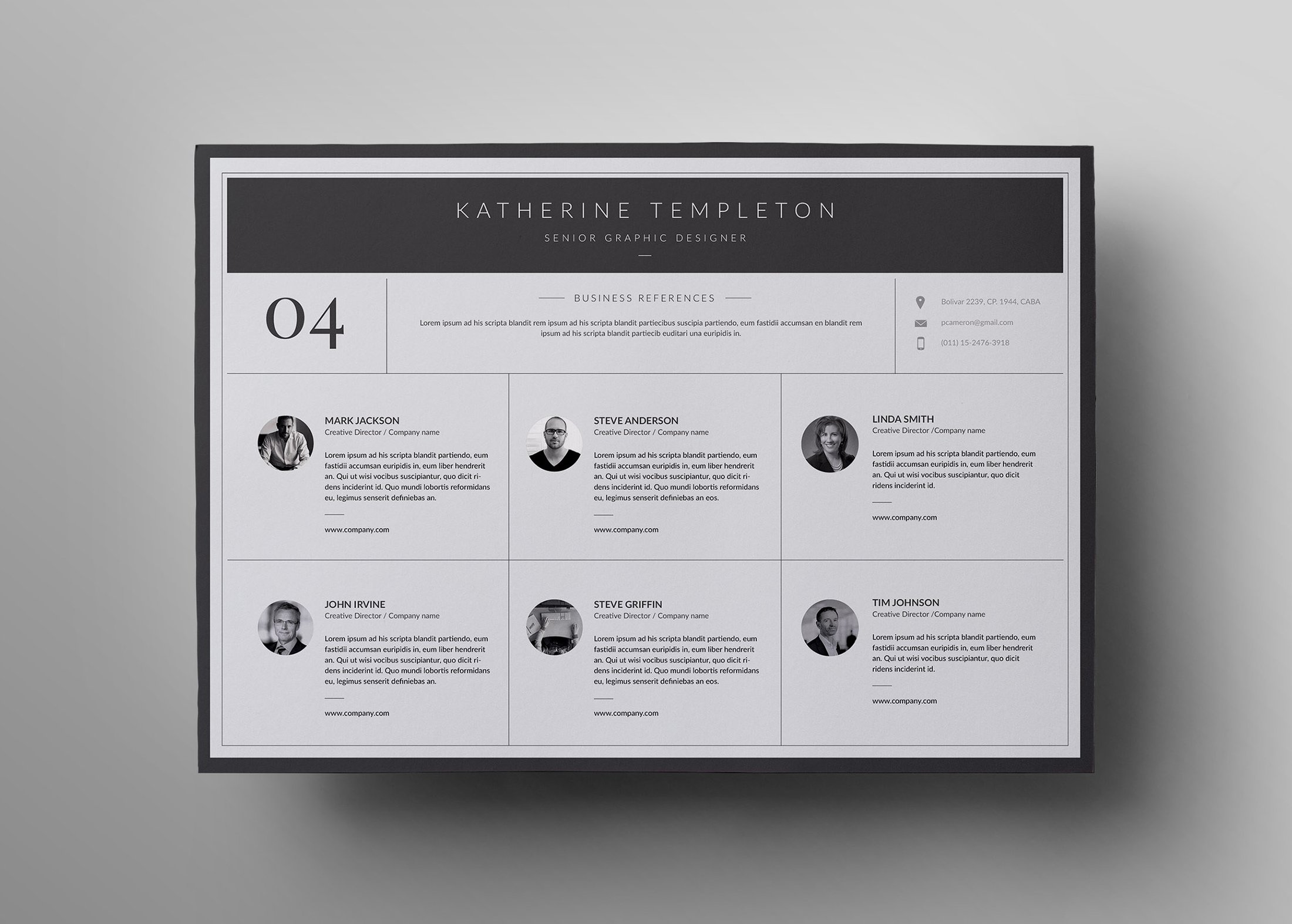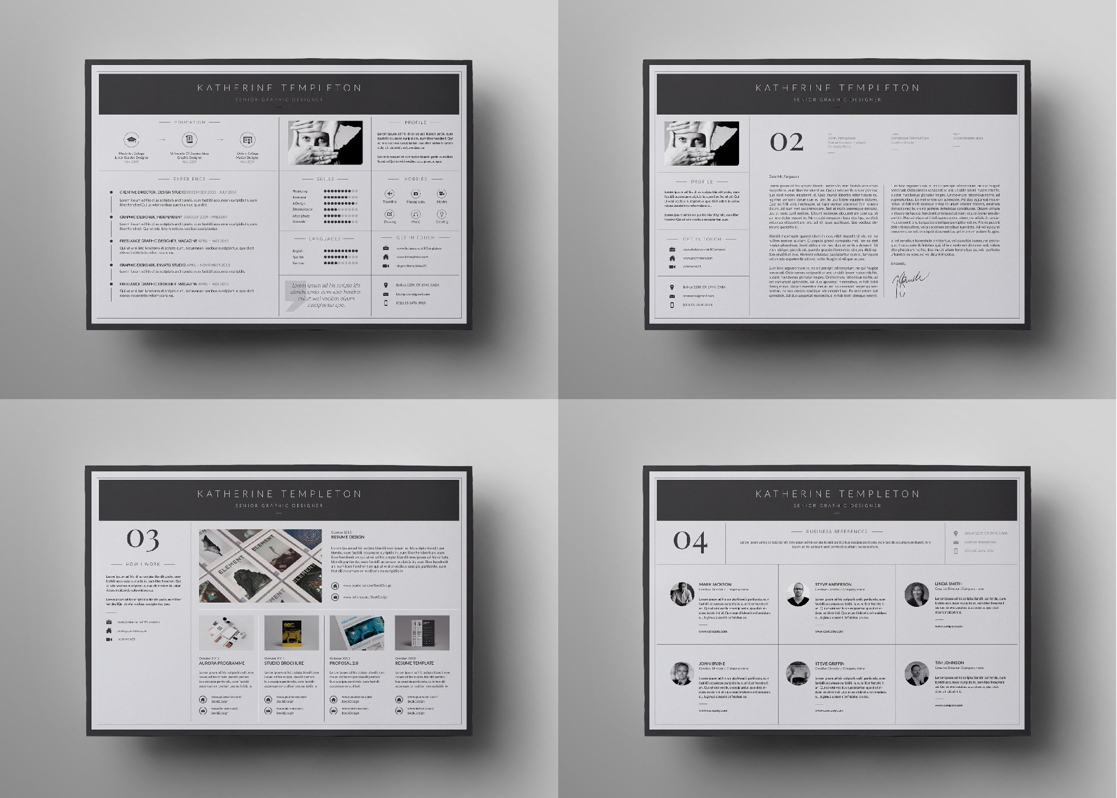 Professional and creative 4-piece Resume template with clean and trendy layout. Ideal for individuals working in creative fields that require adding images to their written CV. The perfect way to make the best impression.